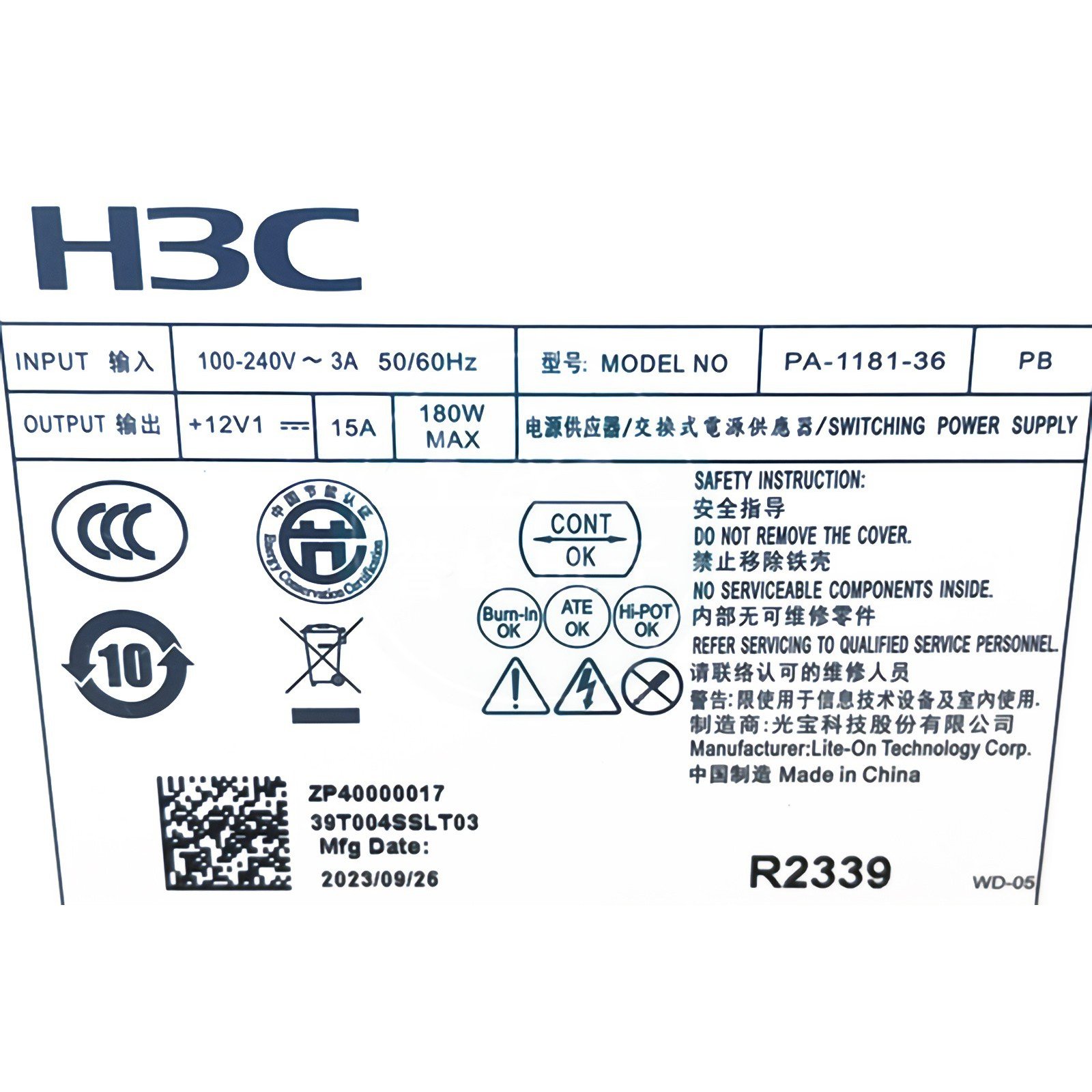 H3C PA-1181-36 ZP40000017 39T004SSLT03 180w